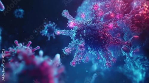 immune, cell, glowing, defense, system, response, biology, health, microscopic, virus, protection, antibody, infection, medicine, science, research, organism, microbe, medicals, fluorescence, nucleus, reaction, immunity, vibrant, energy, molecular, structure, microscopy, biological, illustration, disease, active, attack, healing, regeneration, dark, blue, background