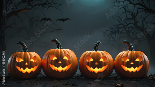 Glowing jack o lantern pumpkins with spooky faces in a dark and eerie halloween night