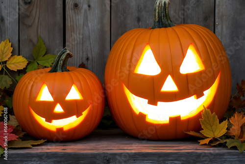 halloween, pumpkin, autumn, fall, carved, glowing, illumination, wooden, festive, holiday, orange, decoration, seasonal, october, leaf, display, light, harvest, symbol, traditional, design, background, scene, closeup, horizontal, nobody, still life, arrangement, table, surface, wood, plank, foliage, season, bright, cheerful, greeting, symbolic, event