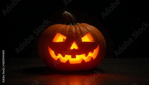 Glowing jack-o'-lantern on a dark background, ready for Halloween celebrations and autumn festivities with spooky vibes.