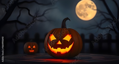 Glowing Jack-o'-Lantern on Dark Night with Full Moon and Silhouetted Trees – Halloween Scene, 3D Render, Spooky Atmosphere, Holiday Background, Digital Illustration