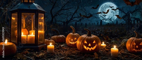 Glowing Jack-o'-Lantern Pumpkin on Rainy Halloween Night,