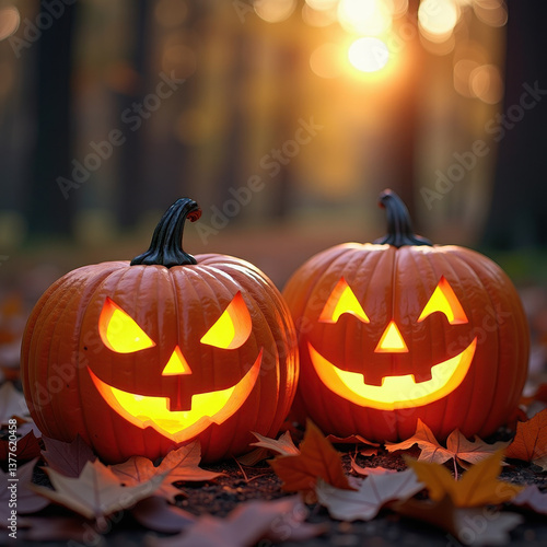 Glowing JackO'Lantern Pumpkins Illuminated Against Autumn Leaves in Forest Floor. A couple of pumpkins sitting on top of a forest floor.