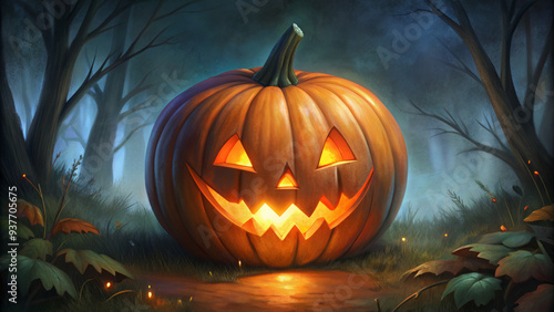 Glowing Jack-O'-Lantern with Evil Grin in Dark Forest, Halloween Night Scene