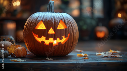 Glowing Jack-o'-Lantern with Friendly Smile on Wooden Surface with Autumn Leaves