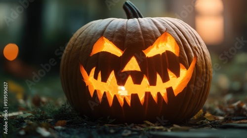 pumpkin, halloween, scarey, face, carved, glow, orange, night, dark, holiday, creepy, skittish, frightening, autumn, fall, decor, tradition, celebration, festive, evil, smiling, grin, teeth, eye, nose, candle, light, warm, illuminated, shadow, leaf, grass, ground, background, blurry, outdoors, nature