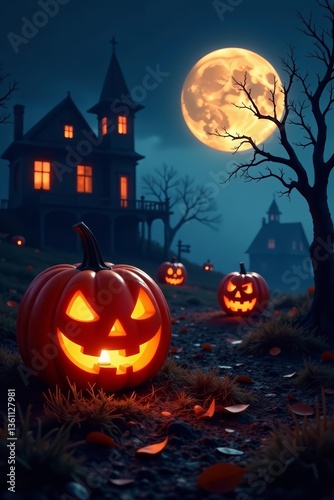 Glowing jack-o'-lanterns, haunted houses, and full moon silhouettes, spooky, haunted house, pattern