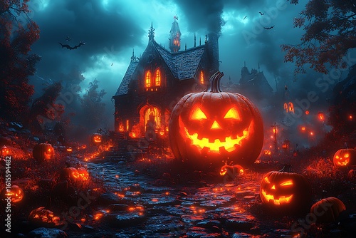 Glowing Jackolanterns Light a Spooky Path to a Haunted House at Night halloween pumpkin