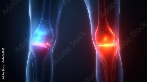 inflammation, pain, anatomy, bod, joint, health care, orthopedics, arthritis, bone, ligament, tendon, cartilage, glow, red, blue, glowing, healthy, disease, medicals, science, illustration, skeleton, radiology, diagnostic, structure, body, injury, muscle, arthralgia, osteoarthritis, rheumatoid arthritis, symptom, diagnosis, treatment, kneecap, femur, shinbone, fibula, articular, femoral, knee, leg, painful, internal, illuminated