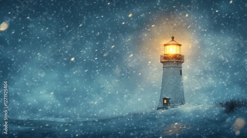 Glowing lighthouse stands strong amidst heavy snowfall at night