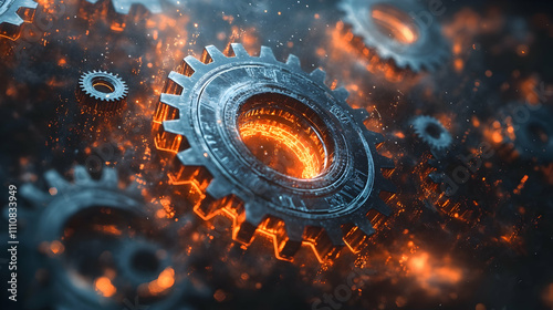 gear, cog, wheel, machine, mechanism, technology, industry, metal, steel, fire, spark, energy, power, motion, movement, innovation, progress, engineering, manufacturing, design, concept, abstract, background, texture, dark, hot, glowing, bright, intricate, complex, detail, closeup, element, part, component, system, network, teamwork, collaboration, efficiency, productivity, work, process, futuristic, science, industrial, factory, workshop, engine