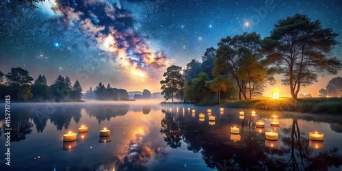 Glowing misty lake under starry night sky with floating candles and lanterns surrounded by tall trees and serene water ripples