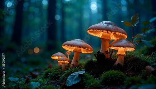 mushroom, glowing, forest, nature, light, dark, twilight, magic, moss, timberland, fantasy, illuminated, plant, outdoors, night, landscape, fungal, aethereal, enchanting, whimsical, background, dreamy, orange, warm, tree, blurred, foliage, ground, scene, magical, mysterious, fairy tale, mystical, environment, autumn, fall, wood, adventure, exploration, calmness, peaceful, serene, beauty, growth, organic