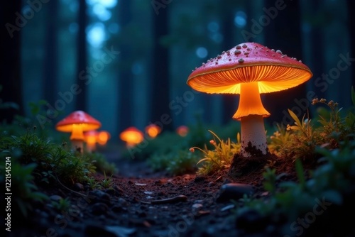 Glowing mushrooms illuminating a dark forest path, glow, light, darkness