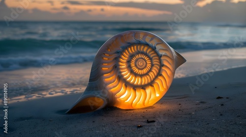 Glowing nautilus shell on the beach