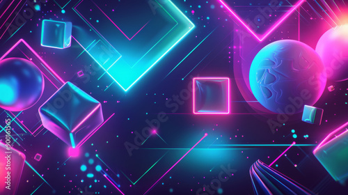 Glowing neon geometric shapes and planet in vibrant retro futurism style