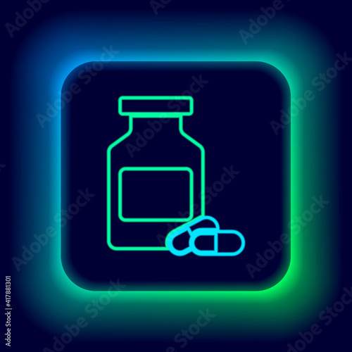 Glowing neon line Medicine bottle and pills icon isolated on black background. Bottle pill sign. Pharmacy design. Colorful outline concept. Vector.