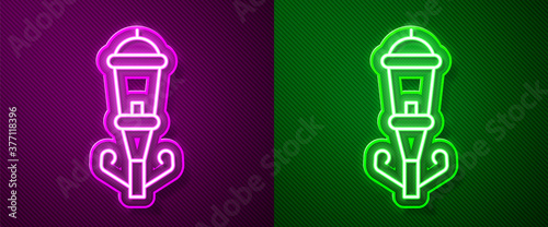Glowing neon line Vintage street light icon isolated on purple and green background. Vector.