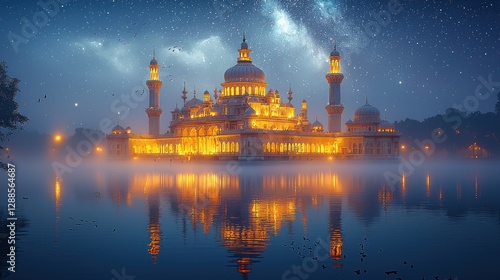Glowing palace reflected in misty lake at night under a starry sky, peaceful scene