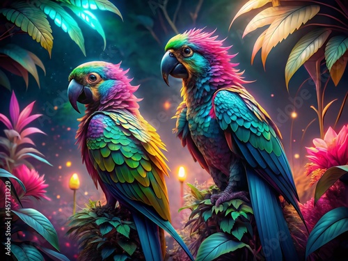 Glowing Parrots in Lush Jungle: Phosphorescent Birds of Paradise