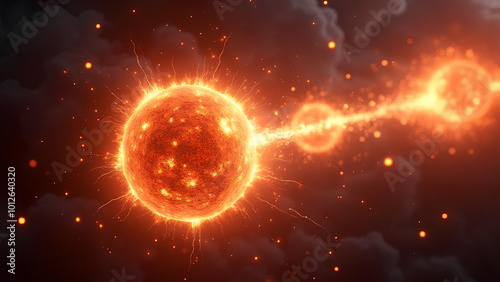 Glowing plasma spheres representing nuclear fusion reactions with energy bursts and particle collisions