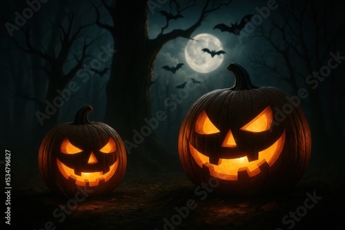 Glowing Pumpkins and Bats in Spooky Forest on Halloween Night. Use for Scary and Spooky Themed Content.