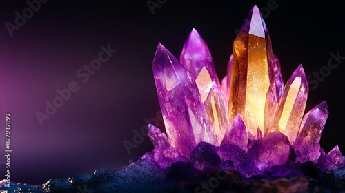 Glowing purple and gold crystals cluster together in a dramatic display. Mysterious and magical!