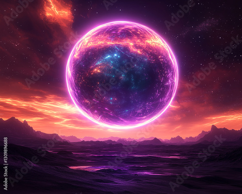 planet, sphere, glow, purple, landscape, mountain, sunset, space, cosmic, nebula, star, sky, night, alien, fantasy, science fiction, artwork, digital artwork, illustration, background, wallpaper, banner, texture, scene, design, graphic, image, abstract, vibrant, dark, mysterious, exploration, colours, art, surreal, view, horizon, energy, light