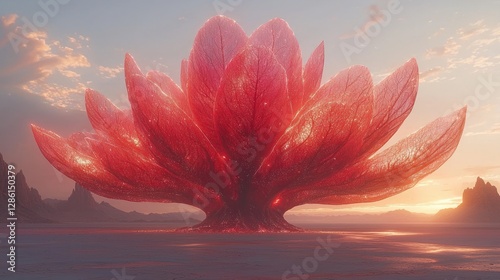 Glowing Red Flower in Arid Landscape at Sunset Fantasy Concept