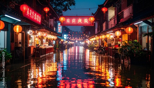 street, lantern, night, rain, reflections, nightlife, serene, magical, mystery, shining, iconic, metropolis, neon, perspective, peaceful, illuminated, glowing, vibrant, aethereal, ornament, moody, weather, radiant, festive, wet, quiet, dramatic, scenery, commercial, scene, aglow, surface, deep, atmospheric, shop, market, oriental, cultural, scenic, historic, district, new, heritage, eastern, evening, light, empty, cinematic
