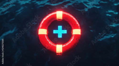 Glowing red medical lifebuoy with blue cross symbol floating in a turbulent splashing sea representing the concept of health insurance as a vital lifeline during times of crisis and emergency
