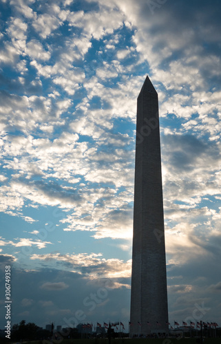 Glowing silhouette of Washington Monument in Washington D.C. at sunset with clouds in background