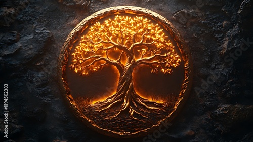 tree, life, glowing, stone, carving, background, dark, mythology, design, game, gold, symbol, ancient, mystical, nature, power, energy, spiritual, sacred, fantasy, root, branch, circle, texture, abstract, art, illustration, graphic, concept, image, digital, artwork, pattern, element, background, wall, mystic, magic, rune, logotype, emblem