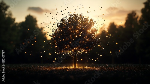 tree, sunset, forest, glowing, digital, art, nature, fantasy, magic, light, landscape, background, illustration, design, sparkle, shine, gold, energy, power, mystical, aethereal, magical, abstract, environment, ecology, concept, hope, growth, life, wisdom, serenity, peace, calmness, beauty, wonder, mystery, imagination, creativity, vibrant, warm, bright, dark, particle