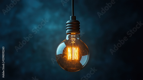 glowing vintage light bulb hangs against dark blue background, creating warm and inviting atmosphere. intricate filament design adds touch of elegance and nostalgia