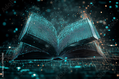 Glowing wireframe illustration of an open book with pages spread, highlighted by blue and black data points on a transparent background, symbolizing knowledge and digital learning.