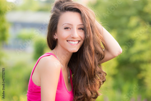 woman, young, pretty, charisma, laugh, hair, teeth, shine, happy, contented, brown, curly, portrait, eye, luck, training, occupation, female, sympathetic, look, future, self-assured, hand, head, smile, sexy, athletic, slim, successful, food, girl, young, youth, top, skin, boy, beauty, tempting, confident, outside, pink, arm, summer