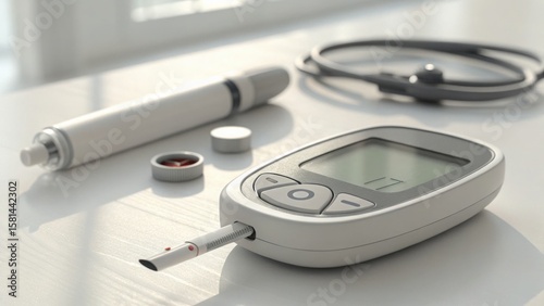 Glucose Meter on White Table with Instruments for Health Monitoring