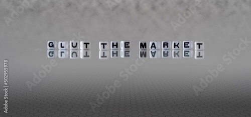 glut the market word or concept represented by black and white letter cubes on a grey horizon background stretching to infinity