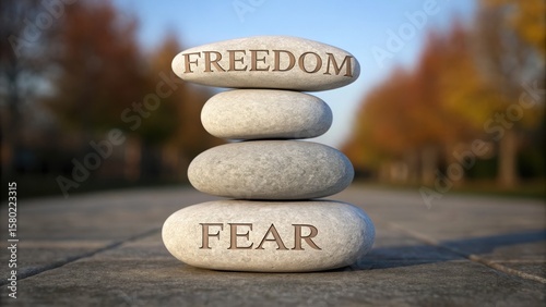 Goal Digger Balanced stones inscribed with the words "Freedom" and "Fear," symbolizing contrast and harmony in nature.