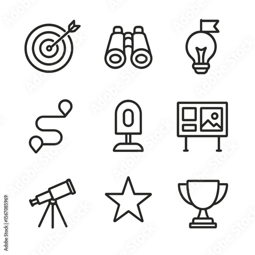 goal, icon, grid, outline, icon, set, setting, vision, target, with, arrow, binocular, roadmap, light bulb, flag, milestone, marker, board, telescope, star, trophy, line, only, black, colours, consistent, stroke