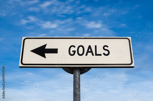 Goals road sign, arrow on blue sky background. One way blank road sign with copy space. Arrow on a pole pointing in one direction.