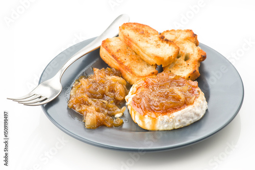 goat, cheese, onion, toast, bread, plate, silver, fork, food, epicure, rustic, dairy, baked, delicious, creamy, savoury, meal, snack, cookery, dining, crispy, dish, ingredient, artisan, kitchen, homemade, culinary, buttery, fried, sweet, organic, fresh, eatery, from above