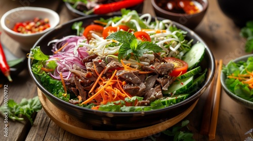 Goi ga salad, bowl of beef and vegetables, table spice appetizer cooked vegetarian food