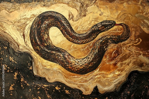snake, reptile, gold, black, painting, art, abstract, texture, scale, curve, swirl, flow, liquid, metallic, shiny, glistering, dark, light, brown, colours, contrast, pattern, design, nature, wildlife, creature, elegance, beauty, movement, energy