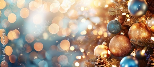 Gold and blue Christmas ornaments on a Christmas tree set against a blurred background filled with bright holiday lights. Copy space image. Place for adding text and design