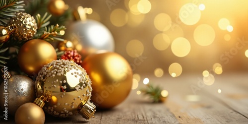 Gold and silver Christmas ornaments clustered on the left side, with a shiny, blurred background on the right for festive greetings or announcements.