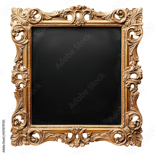 Gold Baroque Frame with Blackboard: An ornate gold baroque frame encloses a blank blackboard, offering a classic and elegant design element perfect for announcements, invitations.