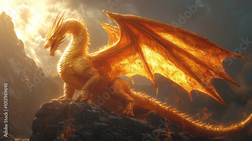 dragon, gold, roaring, atop, rocky, cliff, glowing, wing, illuminated, setting, sun, dramatic, mountain, landscape, bright, orange, light, powerful, horn, scale, claw, wilderness, peak, fantasy, sky, shining, nature, creature, mythical, majestic, regal, scenery, sunlight, sharp, dominant, fierce, radiance, skyward, legend, radiant, strength, high, pride, glow