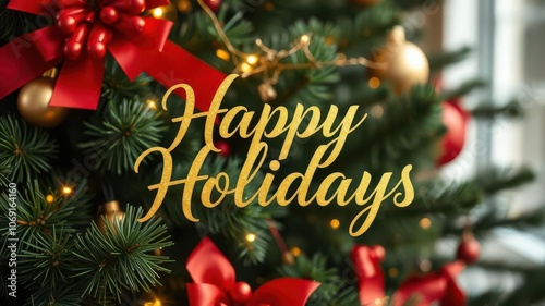Gold Happy Holidays Christmas calligraphy script with a beautifully decorated evergreen tree in the background, creating a festive and elegant holiday atmosphere, decor